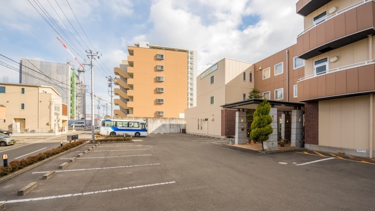 ホテルの目の前には、広々とした普通車23台が駐車可能な平置き駐車場がございます。仙台駅東口より徒歩15分の場所の平置きの駐車場は珍しく、大型車や大型バスが駐車可能なのは丘のホテルだけです。